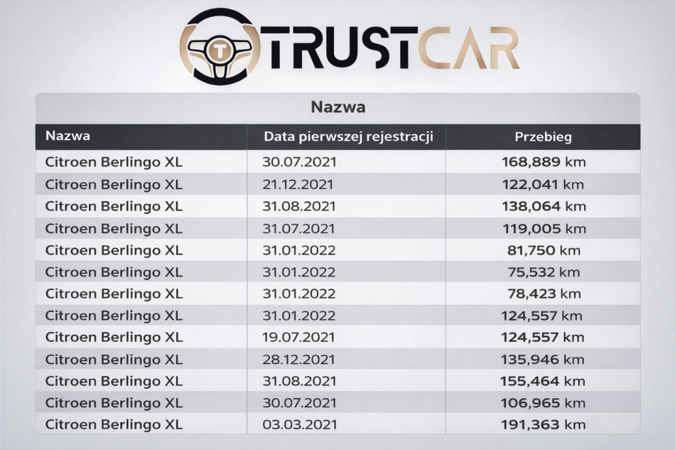 W ofercie mamy kilkanaście samochodów Citroen Berlingo z różnymi przebiegami (lista dostępnych pojazdów znajduje się na grafice dodanej w zdjęciach ogłoszenia)